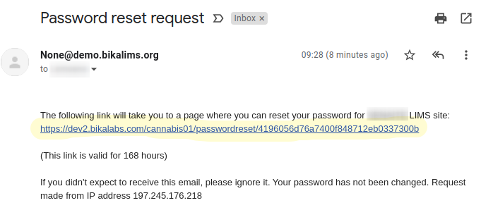 Password reset email in Bika Open Source LIMS