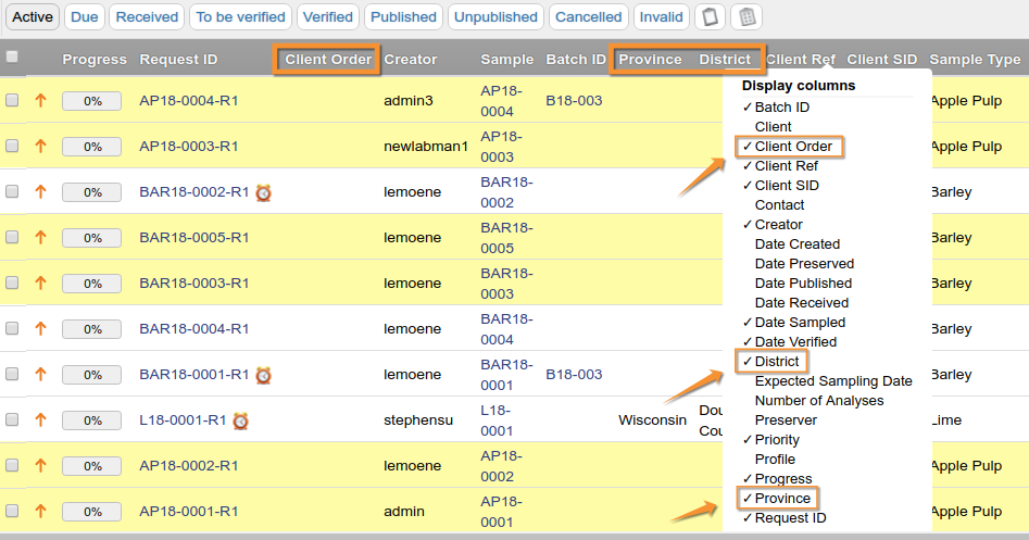 Samples Due and Received in Bika Open Source LIMS lists and tables