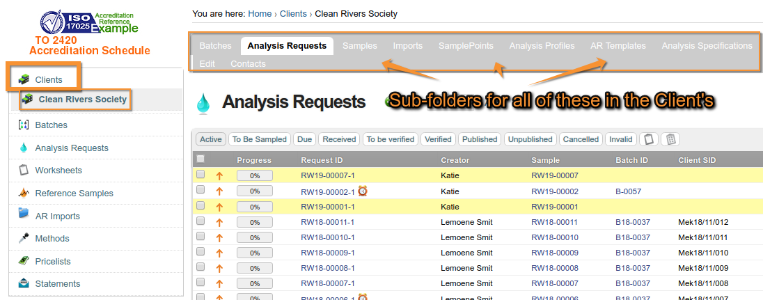 Samples To be Verified and Verified in Bika Open Source LIMS lists and tables