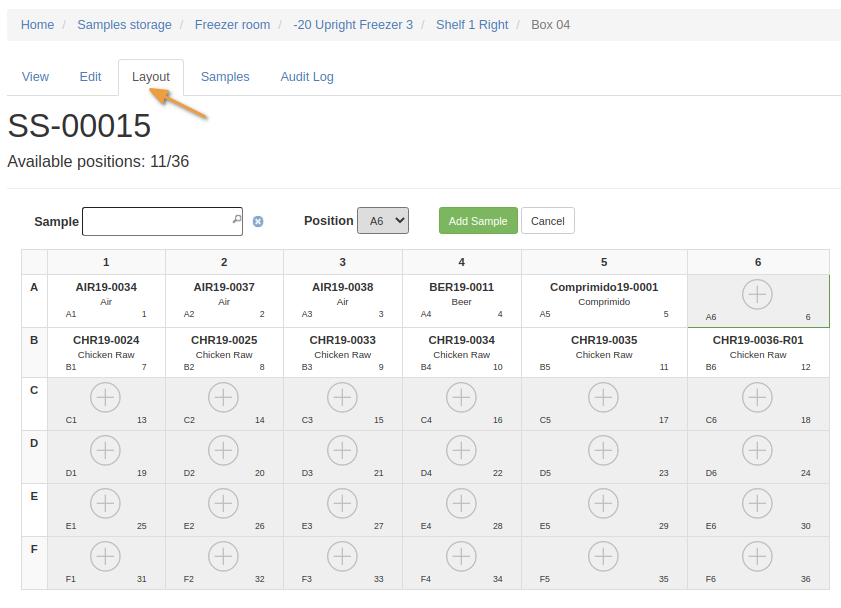 Retrieve Samples from storage on 2D sample box view in Bika Open Source LIMS