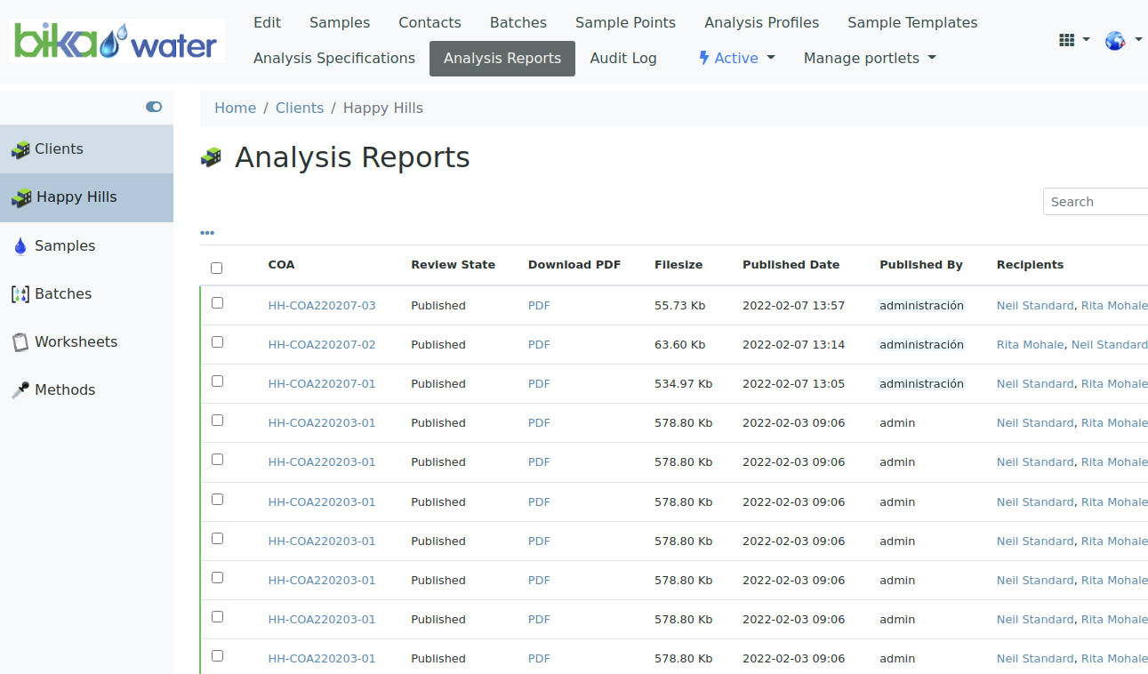 A Client's COA Analysis Reports page in Bika Open Source LIMS