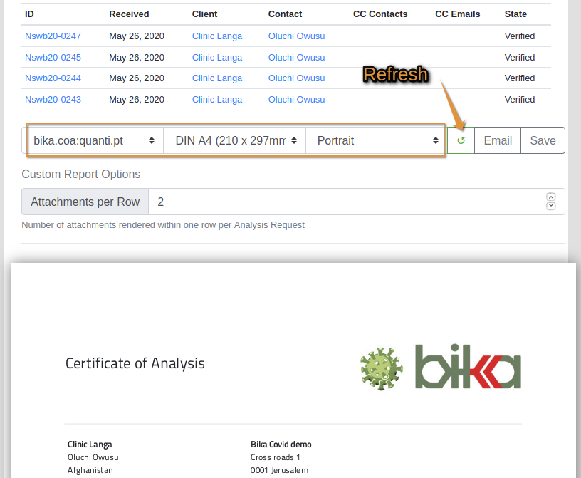 Email COAs from Analysis Reports pages in Bika Open Source LIMS