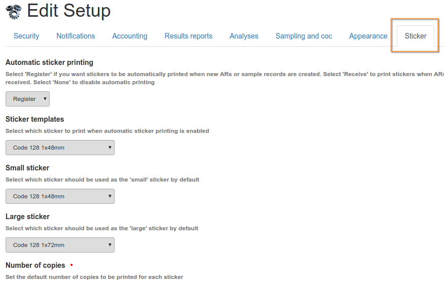 Sampling label and barcode printing setup tab in Bika and Senaite Open Source LIMS